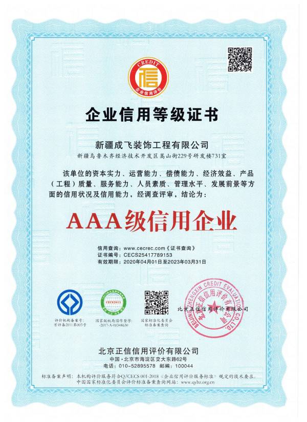 新疆成飛建設工程有限公司是一家以專注于裝飾工程領域,堅持穩健經營、持續創新、開放合作的原則,在星級賓館、高檔寫字樓、大型商場、高級餐館、娛樂設施、車站、銀行等大型室內外建筑工程(包括各類玻璃幕墻、石材幕墻、鋁板幕墻、鋼結構室內裝飾等工程)裝飾裝修...查看更多